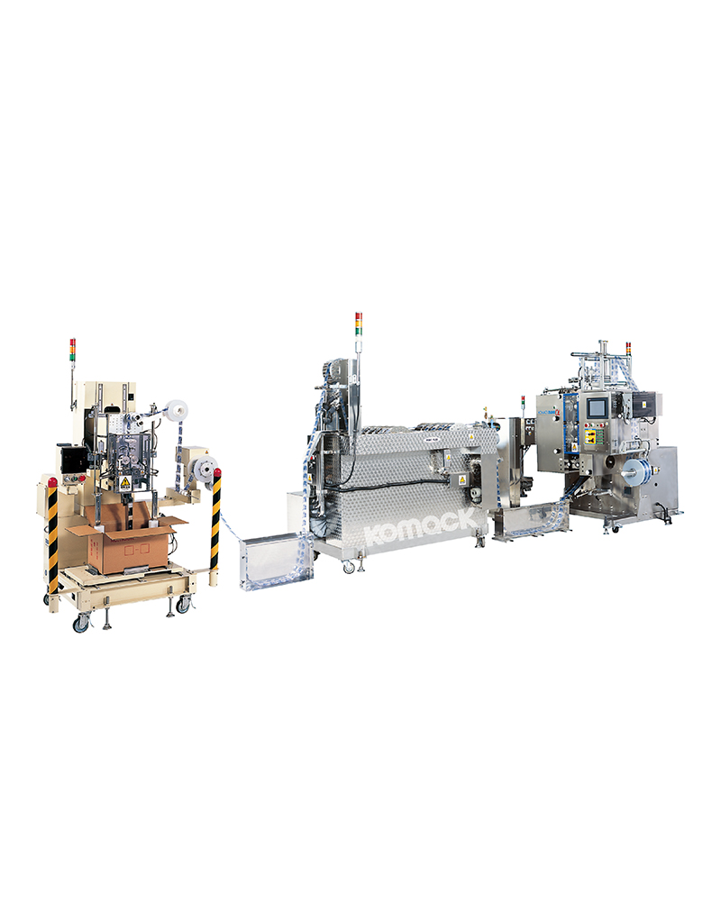 本系統(tǒng)采用連續(xù)帶狀形式的生產(chǎn)線,將熱充填后的產(chǎn)品進行保溫·冷卻·除水。與以往將保溫冷卻除水作業(yè)分開分別進行的生產(chǎn)線相比,連續(xù)帶狀形式具有「因采用邊輕揉產(chǎn)品邊進行保溫·冷卻,所以充填物可均勻熱交換」「因采用低溫殺菌,所以可保持產(chǎn)品的色·香·味」等優(yōu)點。再加上是連續(xù)進行保溫·冷卻·除水作業(yè),因此用極少的人力就可完成。最后,配備產(chǎn)品折入裝箱裝置,單包切割后進行裝袋收集等工程,以低勞動力即可獲得高效率。根據(jù)您的需求,請選擇包裝線的配套裝置。